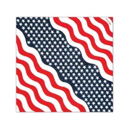 Beistle 60763 Patriotic Bandana. This bandana has a wavy stars and stripes design. It is made of fabric and measures 22 Inch wide by 22 Inch long. The patriotic bandana is a great accessory to add to any outfit on a patriotic holiday.