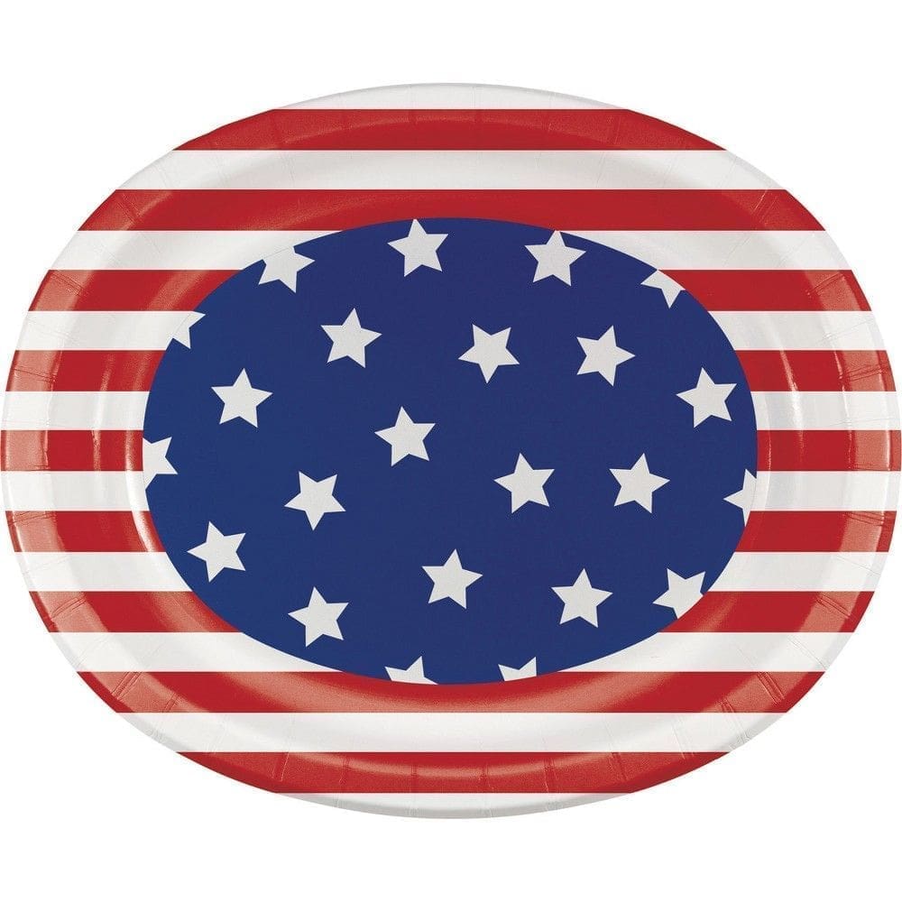 Dig into burgers and BBQ with the Patriotic Oval Plates. These large and durable paper plates feature our countries stars in blue and white with a red and white striped border. Sold in packs of 8, these oval plates are also great for making small platters of cheese and crackers or other munchies for your snack table.? Color: White Red Blue. Gender: unisex. Pattern: Multi Stripe Star.