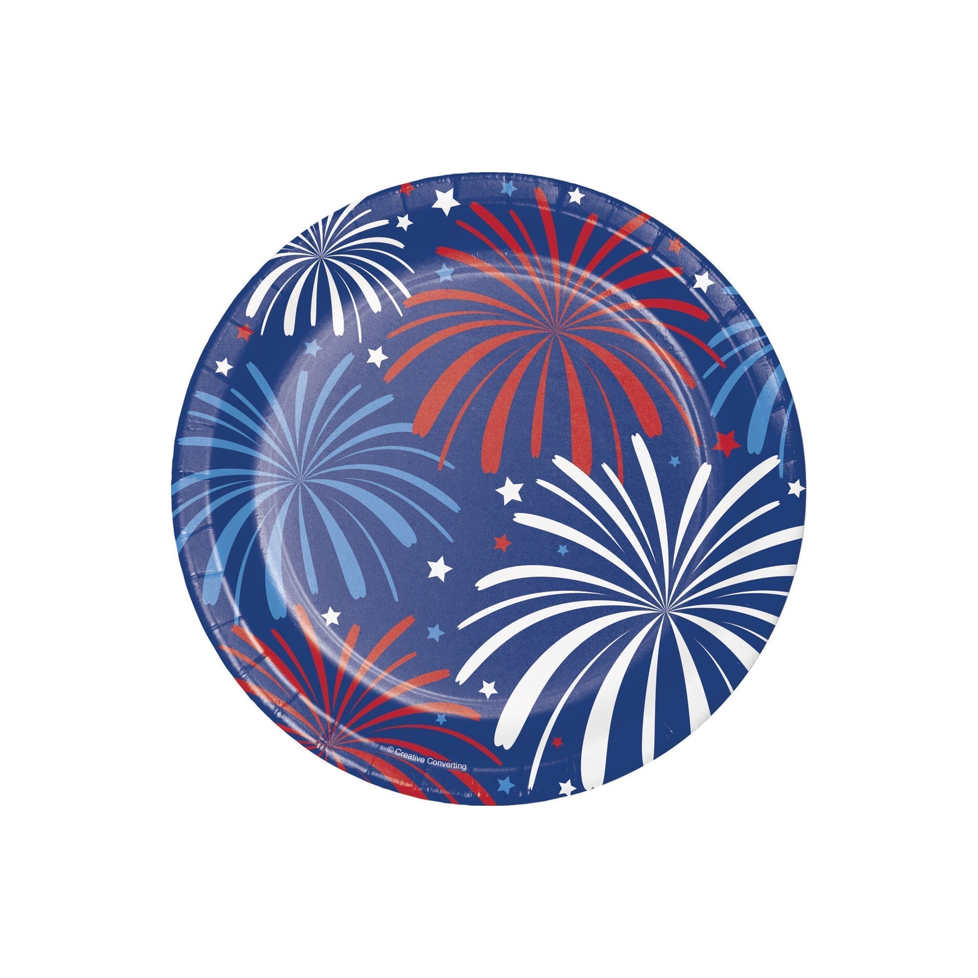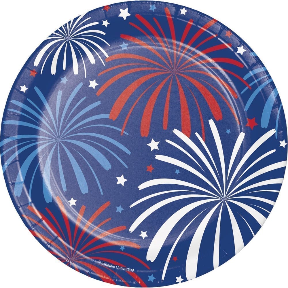 Enjoy the warm summer air with scrumptious snacks served on the Patriotic Cake Plates. These premium strength plates feature a collage of red, white, and blue fireworks in a navy blue background. The 7″ snack plates come in packs of 8 and coordinate perfectly with other Patriotic tableware and decorations.