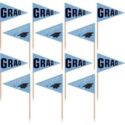Pick out the perfect party supplies for the new grad including Powder Blue Graduation Flag Picks! The wooden toothpicks feature small paper pennant flags in light blue that read Grad on one side and Congrats on the other. With a design accented with stars and a grad cap these picks are perfect for their graduation. Use party picks in cocktails desserts or snacks! Powder Blue Graduation Flag Picks product details: 36 per package Flags 1 3-4in wide x 1 1-4in tall Picks 2in tall.