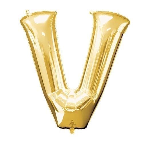 A 34 Gold Letter V Balloon is perfect for adding a personalized touch to your next event! Combine this gold letter balloon with other letters for a custom message at a graduation birthday baby shower or wedding. The metallic finish of this foil balloon makes for an eye-catching decoration. Gold letter balloons also make a trendy photo booth background at your event. 34 Gold Letter V Balloon product details: 32in wide x 32in tall Foil Self-sealing Reusable Balloons arrive uninflated. Helium inflation available at Party City stores. No additional cost. Show of receipt required. No maximum quantity. Always dispose of balloons properly. Do not release balloons into air. California residents will be required to purchase a balloon weight with any foil balloon inflation at Party City stores if they do not already have one.