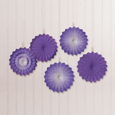Add a splash of bold color to your celebration with Mini Purple Patterned Paper Fan Decorations! The set features fans with ombre hexagonal and striped designs. Simply use the attached strings hang them up for all to see. Mini Purple Patterned Paper Fan Decorations product details: 5 fans per package 6in diameter Arrives flat Simple assembly required.