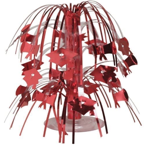 Our Red Mortarboard Mini Cascade Centerpiece features shiny diplomas and caps hanging off of metallic strands. Each metallic foil Mini Red Graduation Cascade Centerpiece measures 8 1/2″ high and has a clear plastic stem with a round base. Place several of these Red Mortarboard Mini Cascade Centerpieces to add color and shine to your grad party!