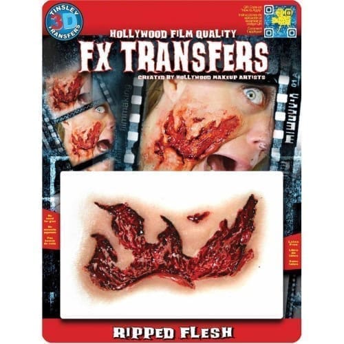 This bloody ripped flesh transfer is perfect for adding some gore to your costume! Created by Hollywood makeup artists, this face decal will have people wondering if it;s real!Material: Medical grade glueImportedNote: Apply with water – Makeup – – Spirit Halloween.