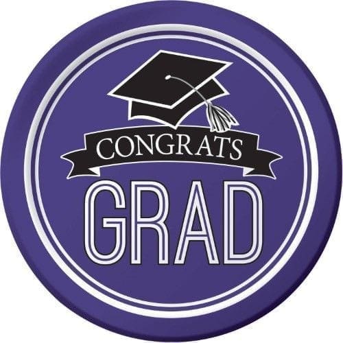 Serve up slices of delicious graduation cake with the School Spirit Purple Dessert Plates. Featuring a classy design of a mortarboard and “Congrats Grad” message in the center, these Sturdy Style cake plates will provide a nice touch to the end of a long journey. Coordinate these round plates with other graduation theme party supplies to celebrate the hard-working graduate’s accomplishment.