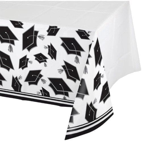 Dress your table in style for the graduation celebration with this School Spirit White Table Cover. This 54″ x 102″ tablecloth is plastic and features border print of an assortment of graduation caps atop a white background. Perfect for indoor or outdoor use, the table cover can be mixed and matched with other School Spirit tableware for a wonderful graduation party. Sold Individually.
