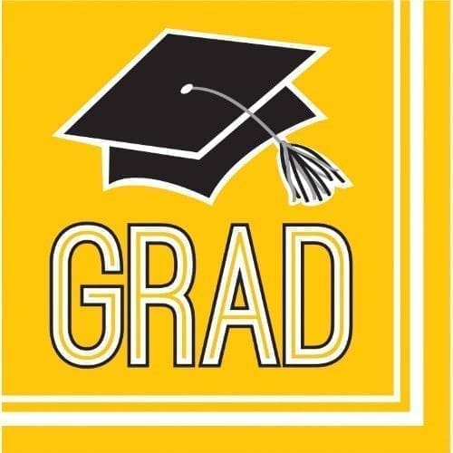 Celebrate the graduate’s accomplishment in style with the School Spirit Yellow Napkins. Perfect alongside tasty entrees or stacked at the buffet table, these paper napkins display a mortarboard and large white text reading “Grad” in the center. Match this tableware with other products in your school colors to show your school spirit. Napkins come in packs of 36.