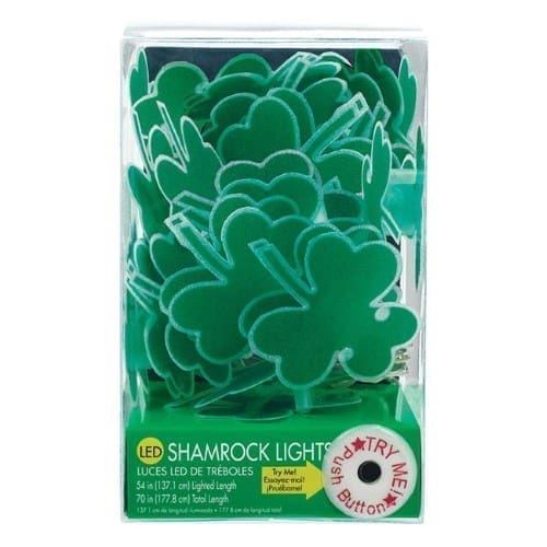 You can’t get luckier than light-up shamrocks! Shamrock String Lights are perfect for your St. Patrick’s Day backyard party. When your party guests aren’t ready to go home these battery-operated LED shamrock lights make sure the festivities last all evening! Shamrock String Lights product details: 70in total length 54in lighted length 10 LED lights Battery-operated Includes battery.