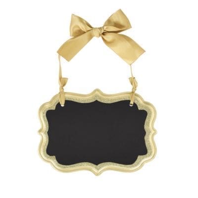 Add a cute and sparkling look to your next event with a Small Glitter Gold Border Scroll Chalkboard Sign! This fiberboard small chalkboard sign features an elegant curved border in gold and gold glitter. Great for displaying table numbers names or buffet table items this versatile chalkboard sign is easy to hang by the attached gold satin ribbon and includes a removable gold satin bow so you can decorate your gold wedding bridal shower or baby shower! Small Glitter Gold Border Scroll Chalkboard Sign product details: 5 1-2in wide x 4in tall Fabric and MDF (Medium Density Fiberboard) Attached loop 3in drop length Chalk not included.