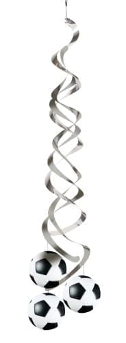 Our Soccer Deluxe Dangler have metallic silver swirls with soccer ball cutouts on the bottoms. Each package of Soccer Deluxe Danglers include two 36″ long decorations with 3″ cutouts. The Soccer Deluxe Danglers are a great way to decorate for your soccer themed party.
