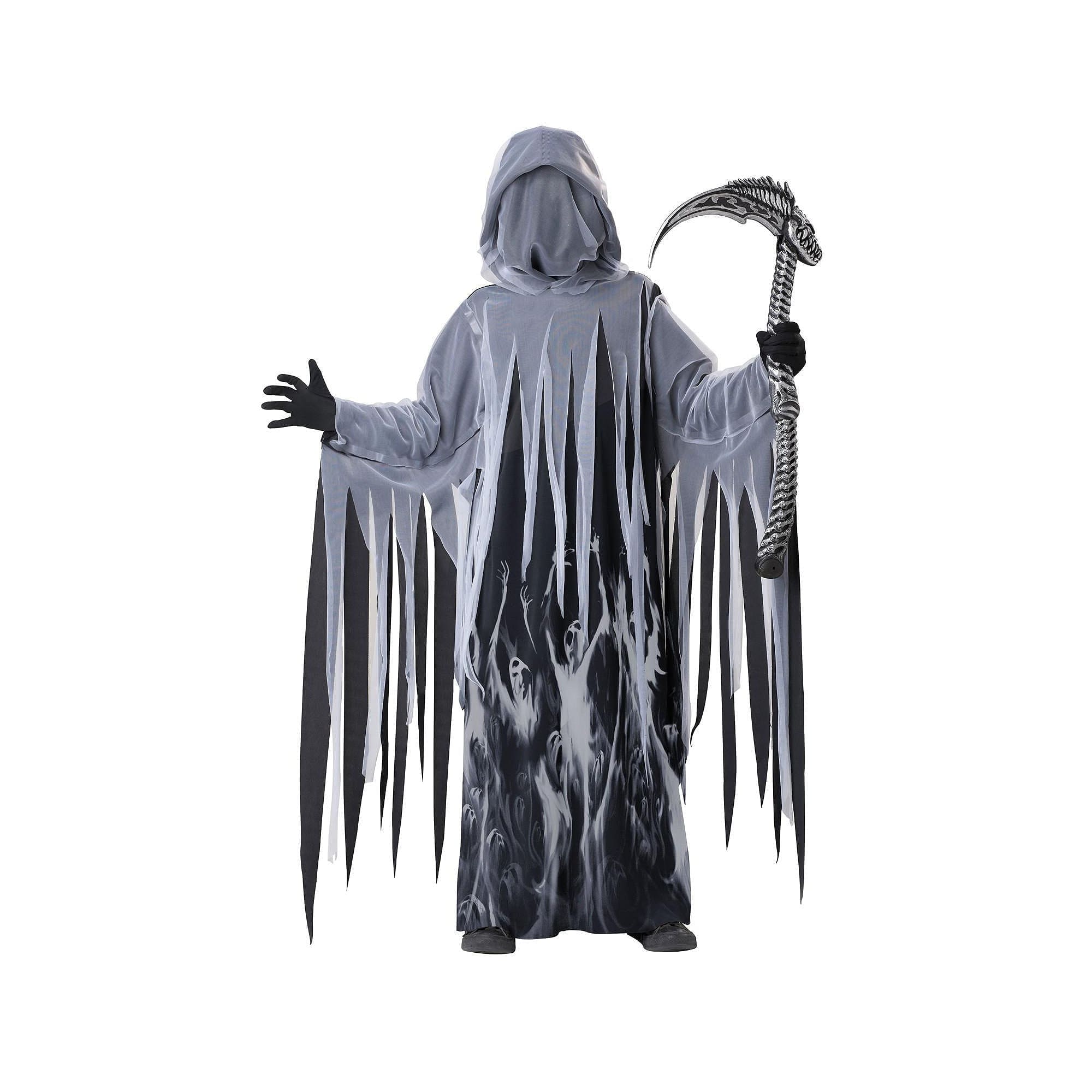 This costume is perfect for the working man- er, soul taker. The black hooded robe fastens at the back of the neck and is made of a polyester knit mesh. The robe has wispy white poly knit mesh draped from the neck and shoulder, to really give it that scary factor. It’s perfect for this costume because they always say to dress for the job you want! The sleeves have black fringes along the length, and the bottom of the robe is printed with white souls reaching up. All in all, it’s a very scary costume for a very scary job!
