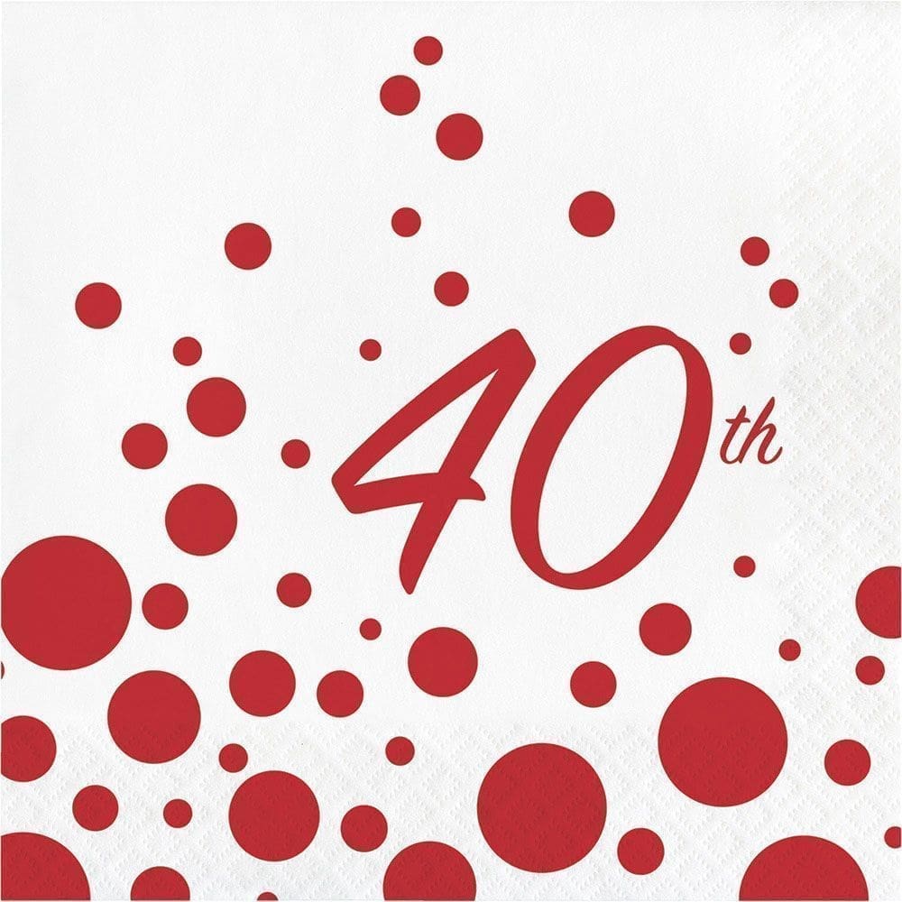 Bring a shimmering sense of elegance to your party tables with the Sparkle and Shine Ruby 40th Anniversary Napkins. Each facial quality tissue measures 6.5″ and features a ruby “40th” text with polka dots of various sizes with a matching border ? perfect for your 40th anniversary. Sold in packs of 16, this tableware item is an excellent addition to your memorable celebration. Color: Red. Pattern: Numbers Polka Dots.
