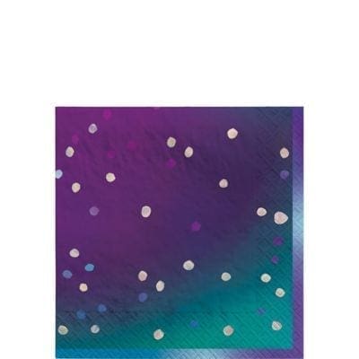 Complete the elegant look of your bar or dessert display with sapphire-inspired beverage napkins. The small two-ply paper napkins feature a purple and green ombre background with iridescent dots in blue purple and white. These eye-catching napkins keep your tables clean and make for easy cleanup. Sparkling Sapphire Iridescent Beverage Napkins product details: 16 napkins per package 5in x 5in when folded Detail on one side only.