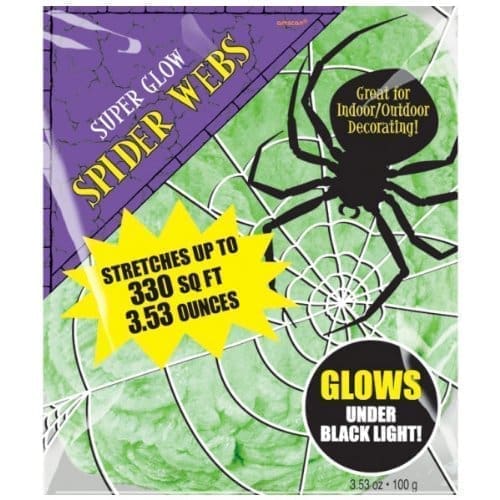 Stretchable Green Spiderweb 330 Square Feet. Green synthetic fiber spider web., Uncoil and stretch over doors and around objects, good for both indoors and outdoors use., This stretches up to 330 square feet., Package weighs 3.53 oz.