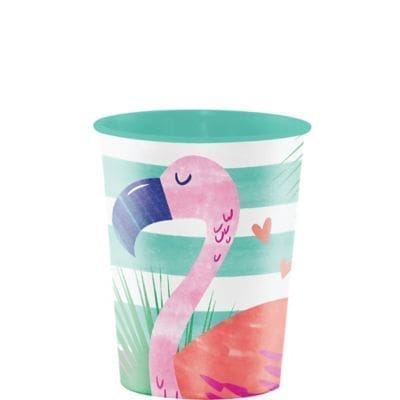 Fill this Striped Tropical Flamingo Favor Cup with sweet summery goodness! Whether filled with an ice cold tropical drink or fun party favors this plastic favor cup is perfect for any summer party. This plastic tumbler features a wraparound pink flamingo print against a striped white and teal background. Fill this reusable cup with candy party favors or cool beverages at your next tropical party. Striped Tropical Flamingo Favor Cup product details: 16oz capacity 3 1-2in diameter x 4 1-2in tall BPA-free plastic Reusable Top-rack dishwasher-safe Not suitable for boiling hot liquids or microwave use.