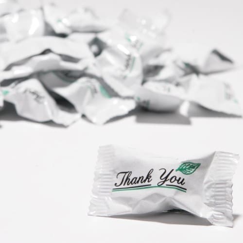 Say thanks in a sweet way. Thank You Pillow Mints have a creamy peppermint flavor. Mints come in white wrappers with Thank You headlines and mint leaves. Place buttermints in favor bags for party guests or display them in candy dishes in the office! Thank You Pillow Mints product details: 50 per package Peppermint flavor Individually wrapped 7oz net weight Certified Kosher Contain milk and soy Fat-free and gluten-free Made in the USA.