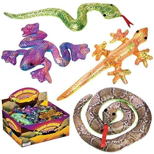 An assortment of sand-filled shimmering fabric reptiles! Includes one assorted reptiles, which include frogs, geckos, snakes and lizards, all dressed in shimmering colorful fabrics. Sizes range from 6 to 12 inches Sand-filled shimmering fabric reptiles, Includes one reptile. Assortment includes: Frogs, Geckos, Snakes or Lizards, Sizes range from 6 to 12 inches.