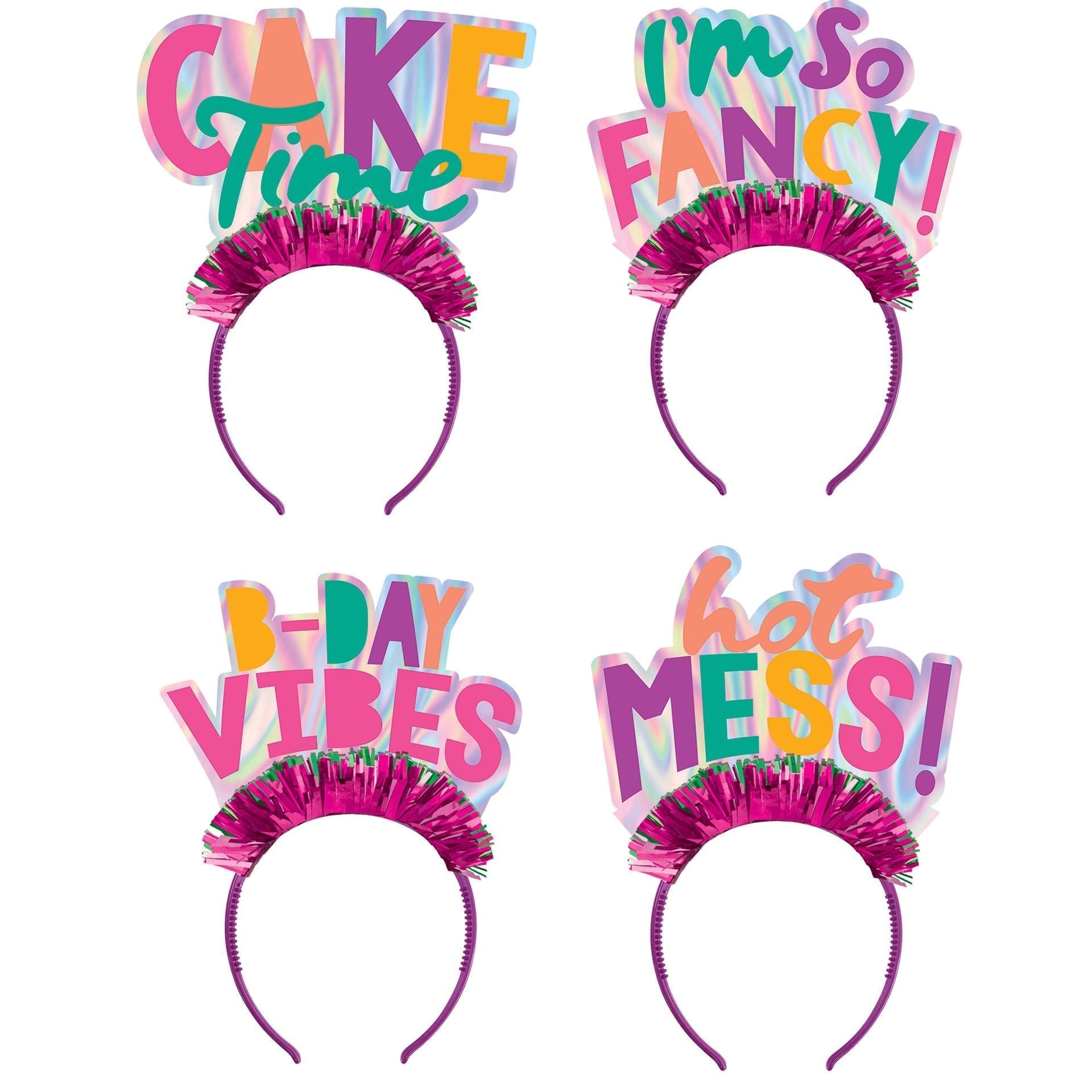 Make sure each guests gets a Young and Fab Headband! These trendy and colorful headbands read Cake Time, I’m So Fancy!, Hot Mess!, and B-Day Vibes. Package of 4 (1 of each design) Made of plastic and paper One size fits most.